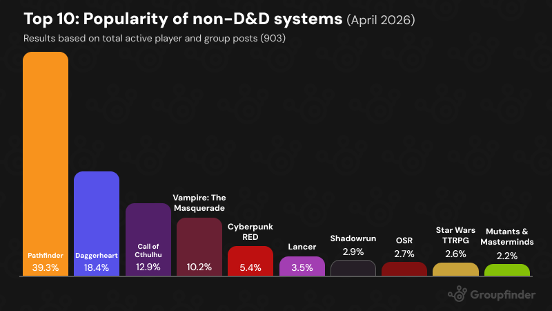 ¿Cuánto se juega online que no es D&D? En Groupfinder han liberado los datos de lo que se sale de la media, los juegos que no son el juego. Está claro que es una gráfica sesgada de un servicio de EEUU y unas 1600 reseñas, pero siempre es interesante ver los otros juegos y encontrarte sorpresas como Lancer, o confirmar que Daggerheart está ahí.